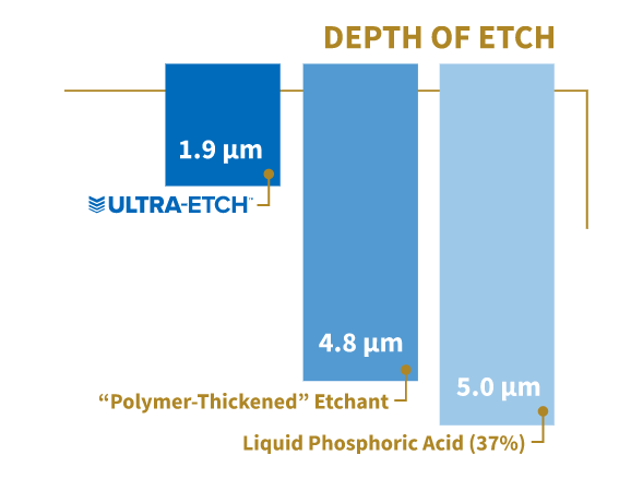 El grabador Ultra-Etch tiene una fórmula única con una viscosidad ideal. Aunque es viscoso, puede penetrar en las fisuras o superficies oclusales más pequeñas debido a las propiedades físicas y químicas que promueven la acción capilar. Sin embargo, su viscosidad ideal mantiene una capa lo suficientemente gruesa como para evitar que se corra en superficies verticales o se seque prematuramente.